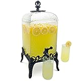 Embody the feel of the French countryside and contemporary Parisian design with this stunning, handcrafted hammered glass beverage dispenser. The intricate designs of the wrought iron look stand holds the dispenser securely in place, while raising it at the same time to accommodate glasses up to six inches in height. The easy to use spigot is ideal for any party or gathering to keep the mess to a minimal, while beautifully displaying your favorite mixed drink, punch, lemonade, iced tea or sangria. The included lid has a matching finial top and helps keep contents cool and fresh.