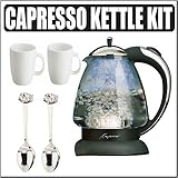 * Capresso H2o Plus 6-Cup Safety Glass Water Kettle features 1 1/2 quart capacity. * Fast, quiet boil. * Safety auto shut-off. * Concealed heating element covered in stainless-steel. * Heat resistant German SCHOTT Glass. * Slip free, textured underside handle. +PLUS+ - Coffee Mug SET OF 2 - DEMI SPOON SET OF 2